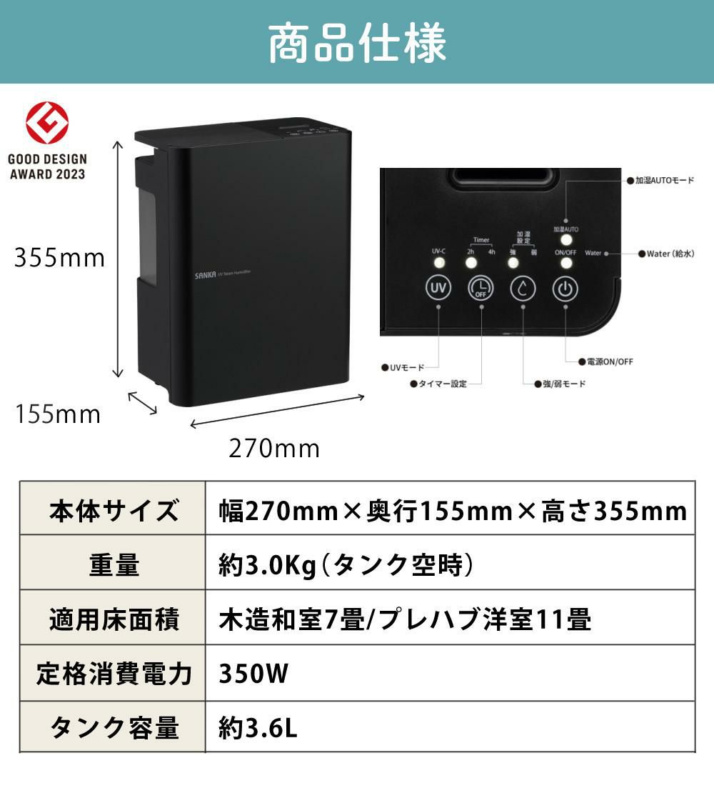 ▼サンカ UVパワースチーム式加湿器 SSH-4100UVBK ブラック
