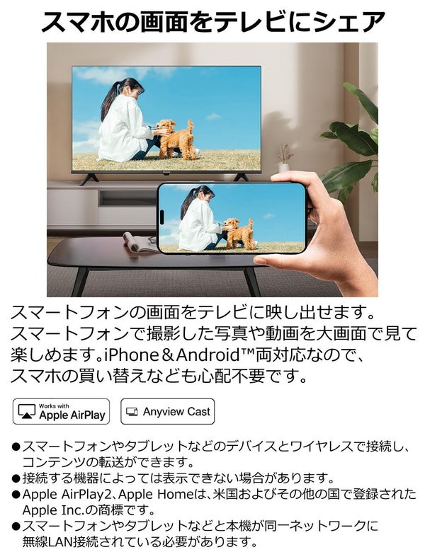 Apple AirPlay2対応により、Apple製デバイスからの画面シェアが可能。