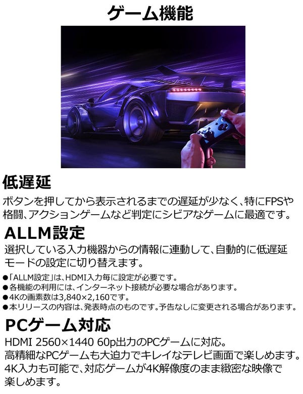 低遅延、ALLM設定、PCゲーム対応で快適なゲーム環境を提供。