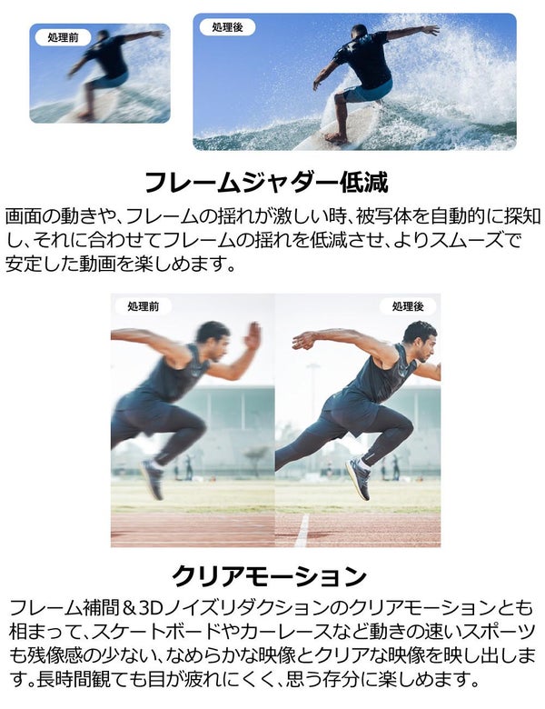 HI-VIEWエンジンLite搭載で4K映像を高速処理。AIネット映像高画質処理、フレームジャダー低減、クリアモーション技術で滑らかな映像を実現。