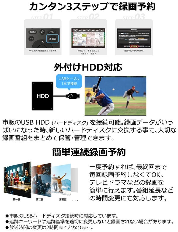 簡単3ステップで録画予約が可能。外付けHDD対応、裏番組録画対応、簡単連続録画予約機能を搭載。