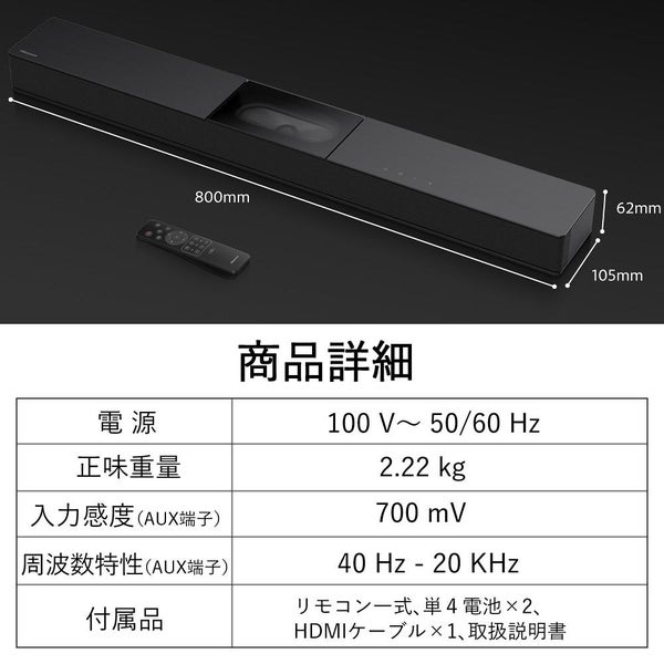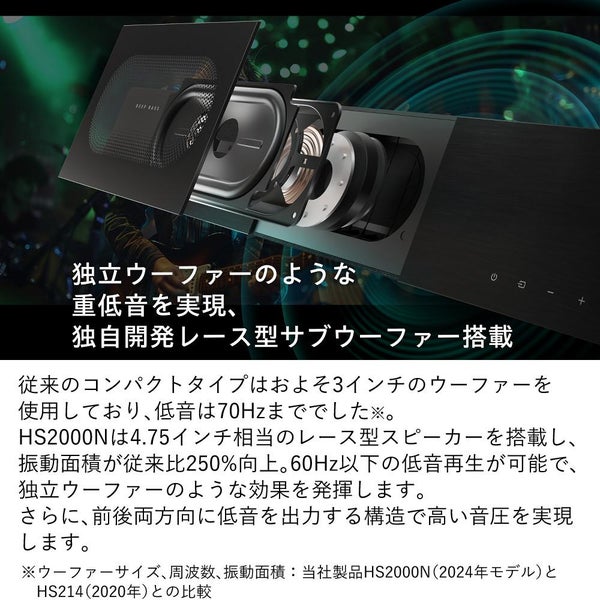 シアターサウンドシステム HS2000N は、 60W の ハイパワー 出力と 重低音 により、臨場感あふれる 迫力サウンド を実現。テレビの 音質改善 に最適で、映画・音楽・ゲーム をより楽しめます。 Bluetooth や 光デジタル 、 AUX入力 に対応し、接続も簡単。幅 800mm の コンパクト設計 で、省スペースながら 高音質 を提供する ホームシアター スピーカー です。