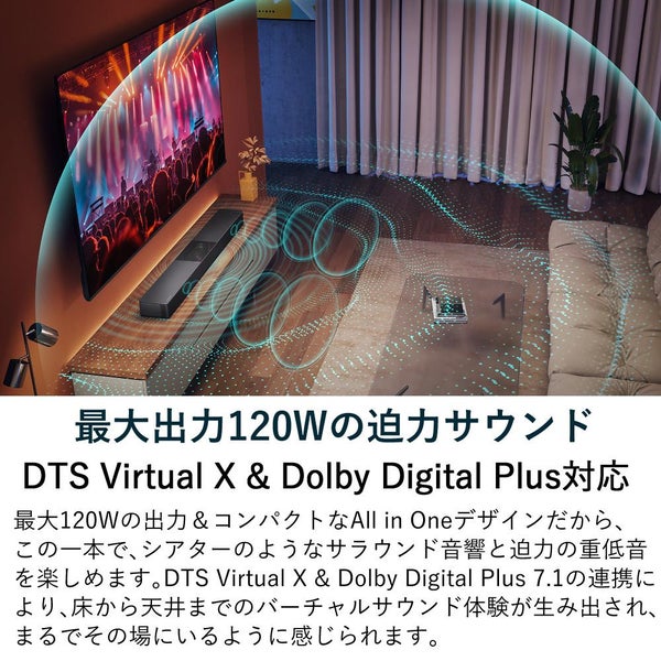 DTS Virtual X & Dolby Digital Plus 7.1の連携により、床から天井までのバーチャルサウンド体験が可能。