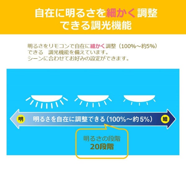 明るさをリモコンで自在に調整(全灯時:100%~約5%)できる調光機能を備えています。