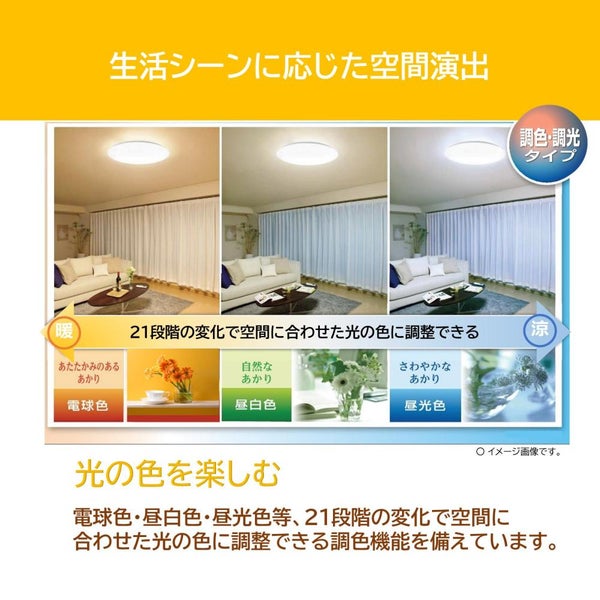 電球色・昼白色・昼光色等、21段階の変化で空間に合わせた光の色に調整できる調色機能を備えています。
