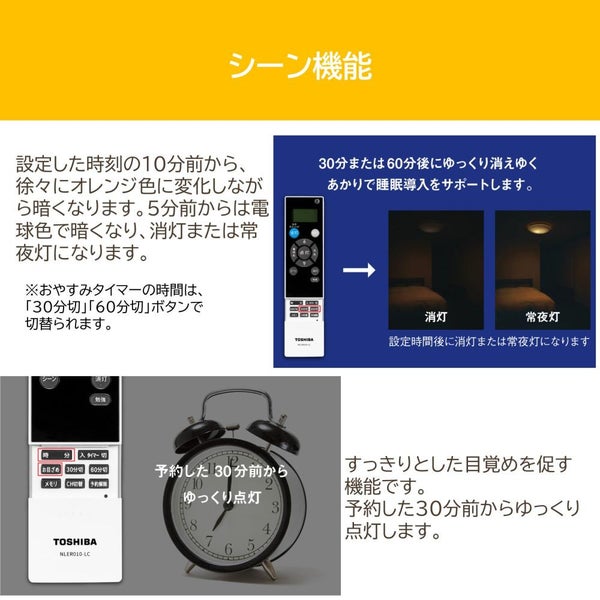 明るさ調整 色調整 (電球色 昼白色 昼光色) ができ、タイマー (ONOFF おやすみ お目覚め) 機能付きで、
