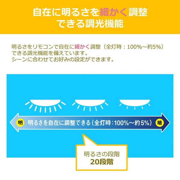明るさをリモコンで自在に調整(全灯時:100%~約5%)できる調光機能を備えています。