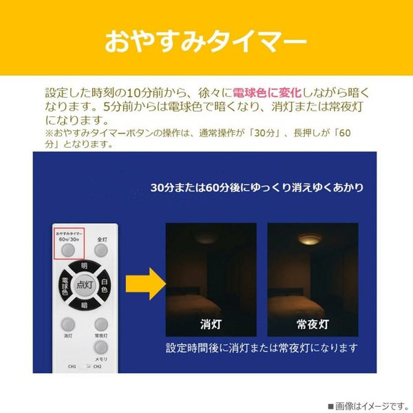 明るさ調整 や 色調整 (調色 電球色 昼白色 昼光色)、おやすみ タイマー があり、