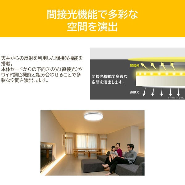 ワイド調色機能を搭載した下向きの光(直接光)と2色切り換え可能な間接光の豊富な組み合わせで自分好みの空間をお楽しみください。