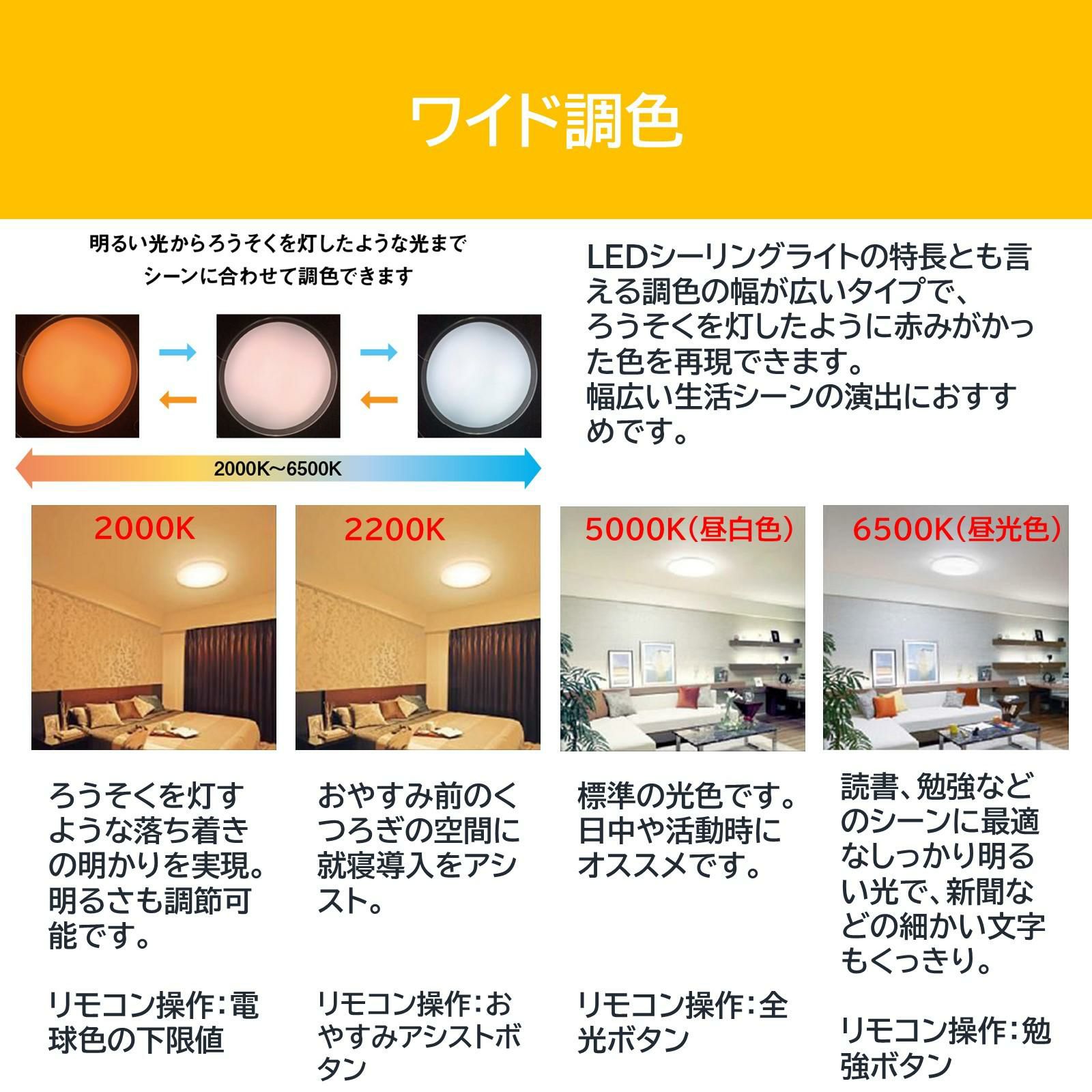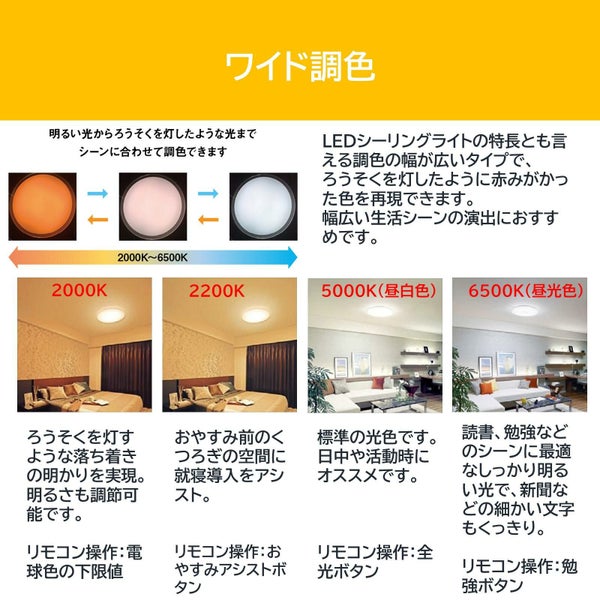 LEDシーリングライトの特長とも言える調色の幅が広いタイプで、ろうそくを灯したように赤みがかった色を再現できます。