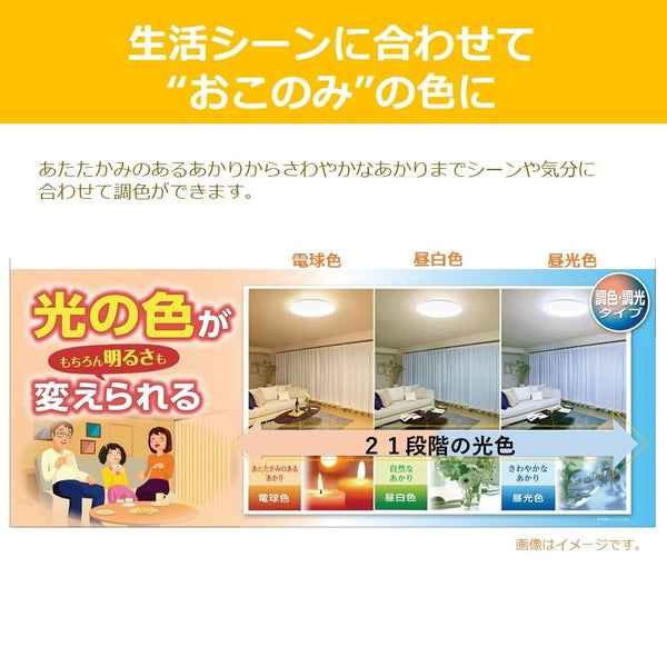 電球色・昼白色・昼光色など、21段階で細かく光の色を調整できる調色機能を搭載しており、お部屋の用途や時間帯に合わせて最適な光色に設定することが可能です。