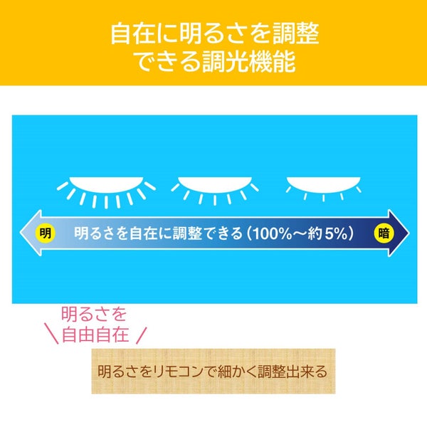 また、明るさもリモコン操作で自在に調整できる調光機能を備えており、全灯時の100%から約5%まで細かくコントロールできます。