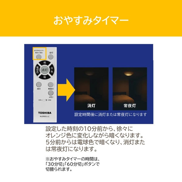 | リモコン操作 | ・連続調光・全灯時明るさ:約5%~100% ・常夜灯6段階調光 ・30分/60分ゆっくりおやすみタイマー ・調光・調色メモリ |