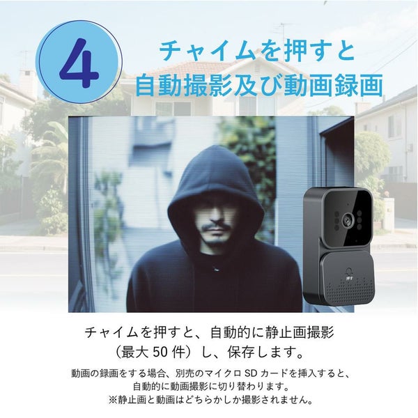 チャイムを押すと、自動的に静止画撮影(最大50件)し、保存します。