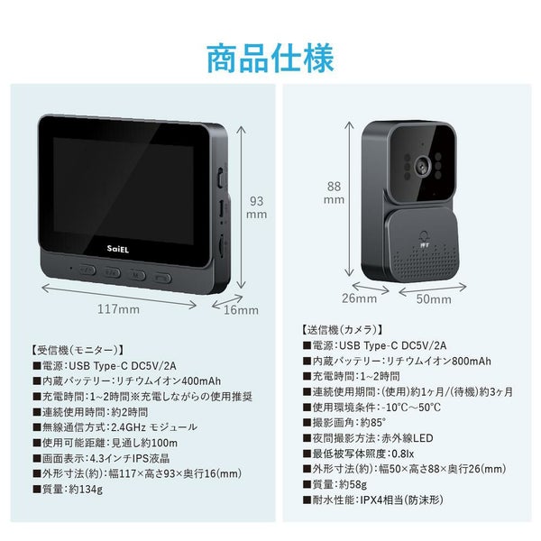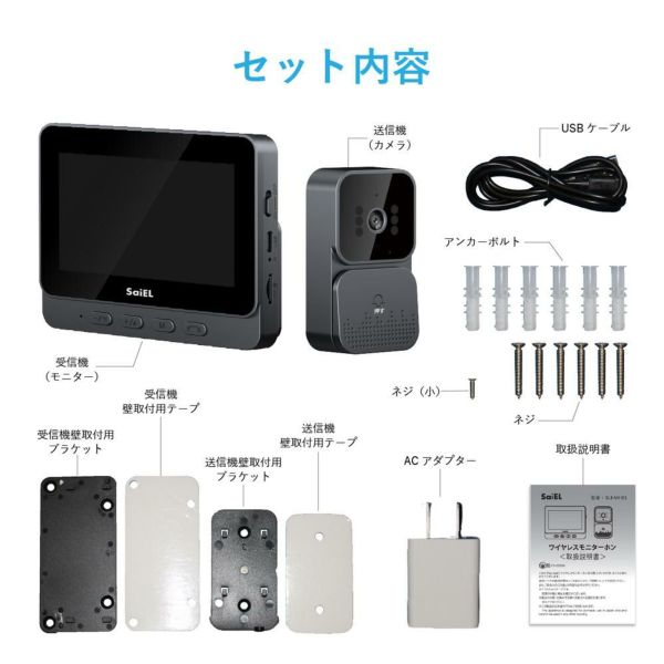 【付属品】受信機(モニター)、送信機(カメラ)、USBケーブル、アンカーボルト、ネジ(小)、ネジ、受信機壁取付用テープ、受信機壁取付用ブラケット、送信機壁取付用テープ、送信機壁取付用ブラケット、ACアダプター、取扱説明書