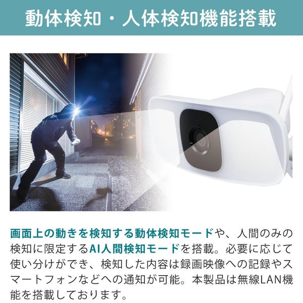 画面上の動きを検知する動体検知モードや、人間のみの検知に限定するAI人間検知モードを搭載。必要に応じて使い分けができ、