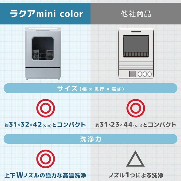 コンパクト で 省スペース 設置 が 可能 な タンク式食洗機 ラクアMini Color 。 工事不要 で 設置 できる 卓上食洗機 なので 賃貸OK 一人暮らし や 2人用 キッチン に ぴったり な 小型食洗機 です。 Wノズル ダブルノズル による 高温洗浄 と 最大 75度 の 温水 で 油汚れ や カレー ソース など の こびりつき も しっかり 洗浄。 洗浄後 は 温風乾燥 で 食器乾燥 まで 自動 で 行える 食器洗い乾燥機。 タンク給水式 食洗機 なので 水道工事 不要、 置き型食洗機 として 使える 便利 な キッチン家電。 洗い物 時短 と 節水 を サポート する 卓上型 食器洗い機 です。
