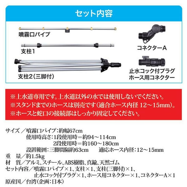 噴霧口パイプ:約幅67cm 使用時高さ:1段使用時/約94~114cm 2段使用時/約160~180cm 設置範囲:三脚間隔約63cm 適合ホース内径 12~15mm |