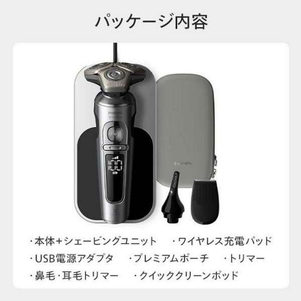 【付属品】ワイヤレス充電パッド、USB電源アダプタ、トリマー、鼻毛・耳毛トリマー、クイッククリーンポッド、クイッククリーンポッド カートリッジ、プレミアムポーチ