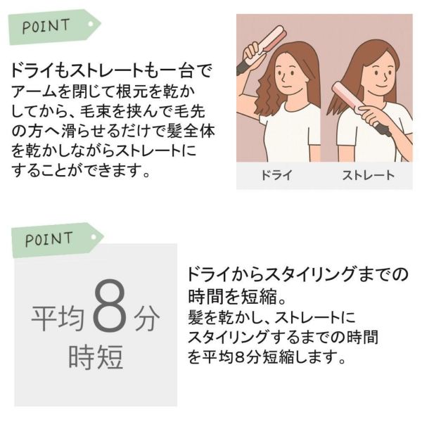 ウェットモードとドライモードを搭載し、濡れた髪からでもスタイリングが可能。