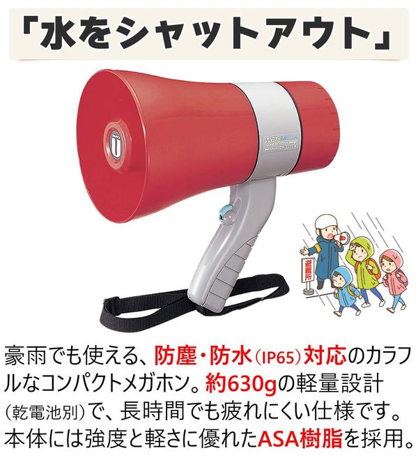 水をシャットアウト 豪雨でも使えるカラフルなコンパクトタイプメガホン。