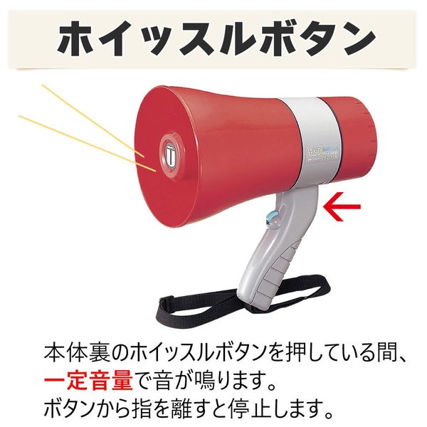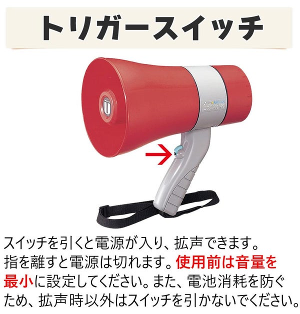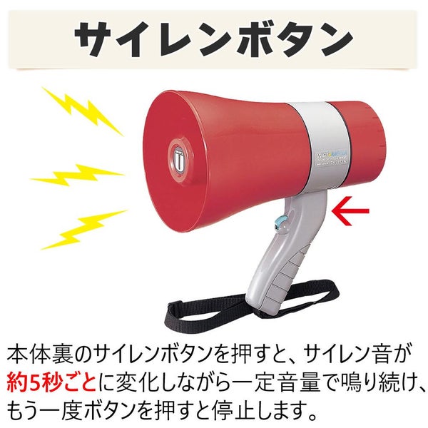 | 特徴・用途 | 外観は耐候性に優れるASA樹脂を採用しています。 外観ビス類はステンレス製を使用しています。 乾電池(単三形)6本を使用し、小形・軽量です。 片手で持ちながら音量調節ができ、使いやすく機動性に優れています。 電子サイレンを内蔵していますので、スイッチ操作でサイレンを吹鳴させることができます。 非常時の避難誘導や群衆整理に最適です。 |