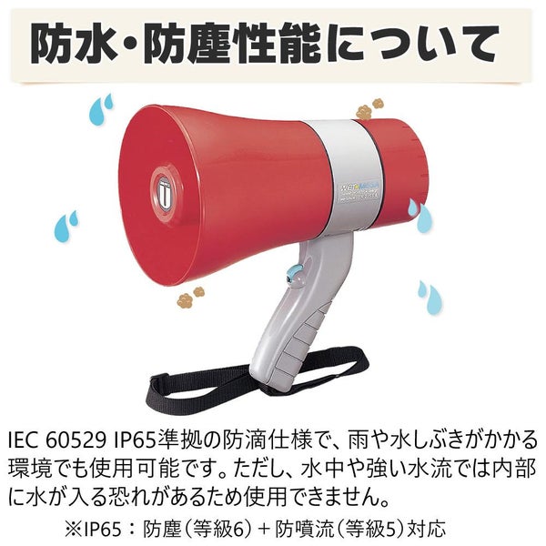 本機はIEC 60529 IP65※1に準拠しています。雨やある程度の水の噴流がかかるような状況でも使用できる防滴形メガホンです。ただし、水中や強い水圧の噴流では内部に水が入ることがありますので使用しないでください。
