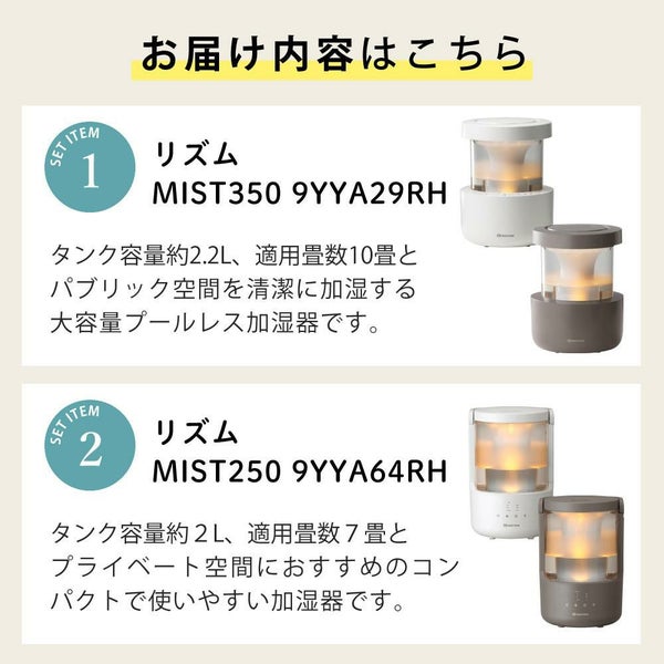 好評の超音波式プールレス加湿器「MIST 350」とのコンパクトサイズ版「MIST 250」をセットにしました。