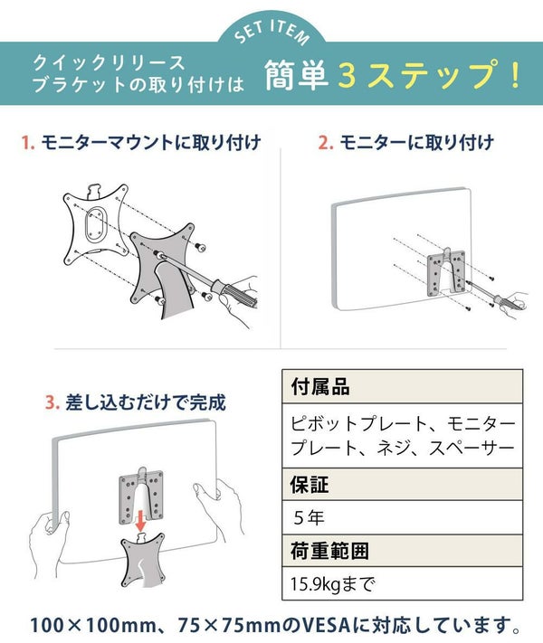 | 梱包内容 | ピボットプレート、モニタープレート、ネジ、スペーサー |