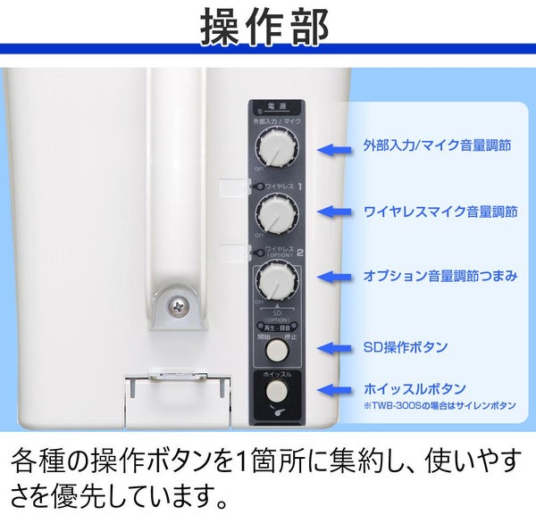 UNI-PEX ユニペックス TWB-300 は 防滴 対応 の ワイヤレスメガホン として 雨天 の イベント や 選挙 集会 に 最適 な 拡声器 です。 IPX5 の 防水 性能 により 屋外 でも 安心 して 使用 でき、 最大 出力 45W ・ 定格 30W の 大出力 で 広範囲 に 音声 を 届けます。 デジタルアンプ 採用 による 省エネ 設計 と 長時間駆動 を 実現し、 乾電池式 で 手軽 に 運用 可能。 コンパクト な 角形 デザイン で 持ち運び しやすく、 ワイヤレスマイク 対応 や 外部入力 Bluetooth対応 SDレコーダー対応 により 拡張性 も 高い 高性能 メガホン です。