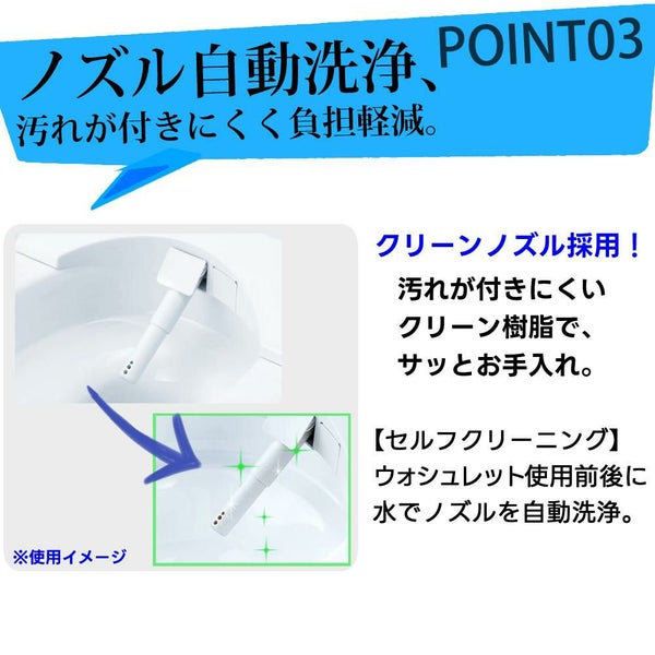 ウォシュレットの使用前後にノズルを自動で洗浄。清潔な環境を保ちやすく、安心してご使用いただけます。また、手間のかかる掃除の頻度を減らすことができ、家事負担の軽減に一役買います。