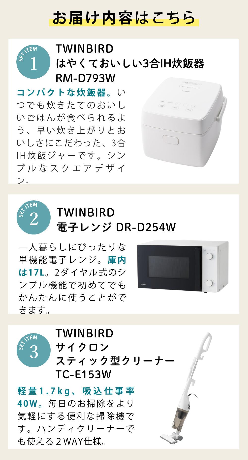 他の画像を見る 届いてすぐに使える、家電3点セット ツインバード 新生活 家電セット 3合IH炊飯ジャー 炊飯器 RM-D793W 電子レンジ DR-D254W サイクロンスティック型クリーナー 掃除機 TC-E153W 販売価格 ¥ 29,800 税込 カートに入れる お気に入りに登録する (0件)