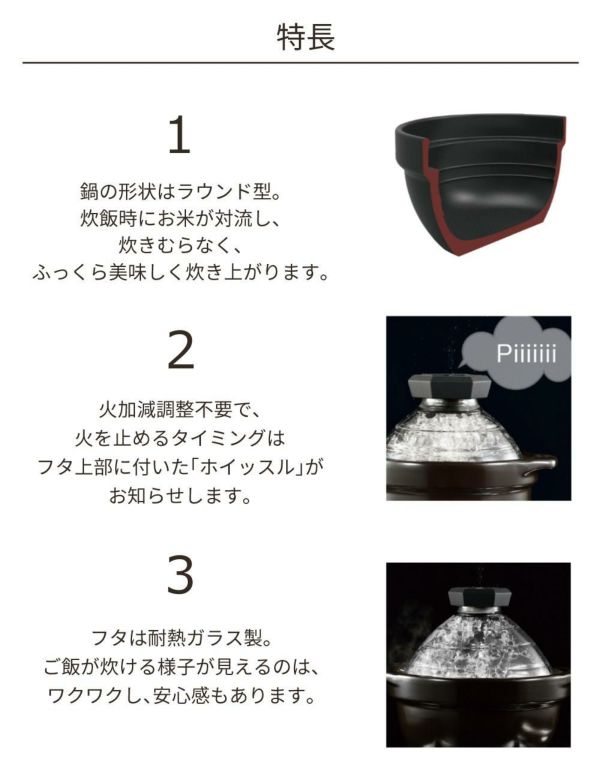 ご飯が炊ける様子が見える、耐熱ガラス製フタのご飯釜。