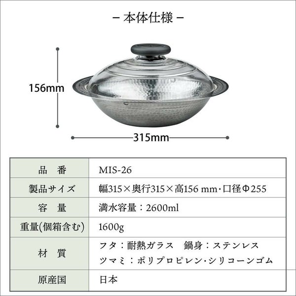 ハリオ MIS-26 フタがガラスのIH対応ステンレス鍋 雪平 26cm