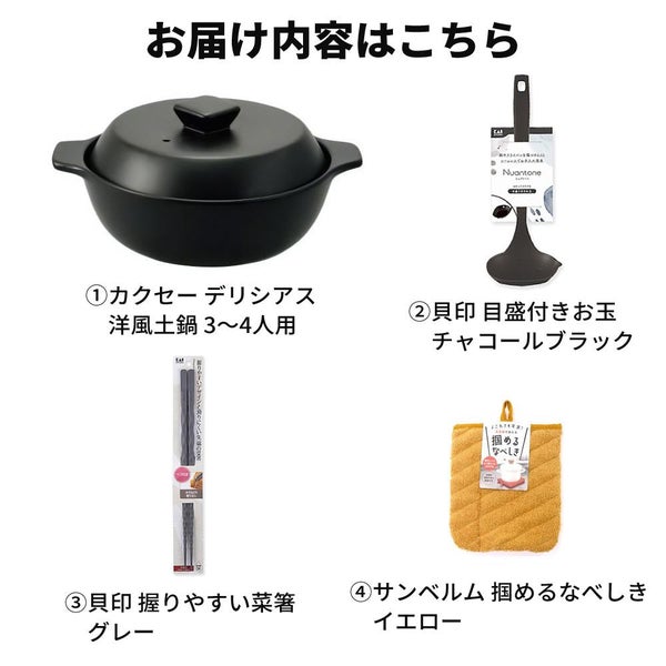 「カクセー デリシアス 土鍋 8号(24cm) 洋風土鍋 セット」は、ファミリーサイズの大きめ鍋で、耐熱陶器の特性によりムラなく加熱し、鍋料理・煮込み料理・シチュー・スープ・蒸し料理まで幅広く対応。直火対応かつ電子レンジ対応で、保温性にも優れます。付属の貝印 DE6319 お玉(目盛付き)、DH8090 菜箸(27cm ヘラ付き)、サンベルム K72904 掴めるなべしき(鍋敷き兼鍋つかみ)をセットにすることで、準備から盛り付けまで一式揃う実用的な土鍋セットです。3?4人用の家族向けサイズで、団らんの食卓やホームパーティーにもぴったり。おしゃれなキッチン雑貨としてギフトにもおすすめ。