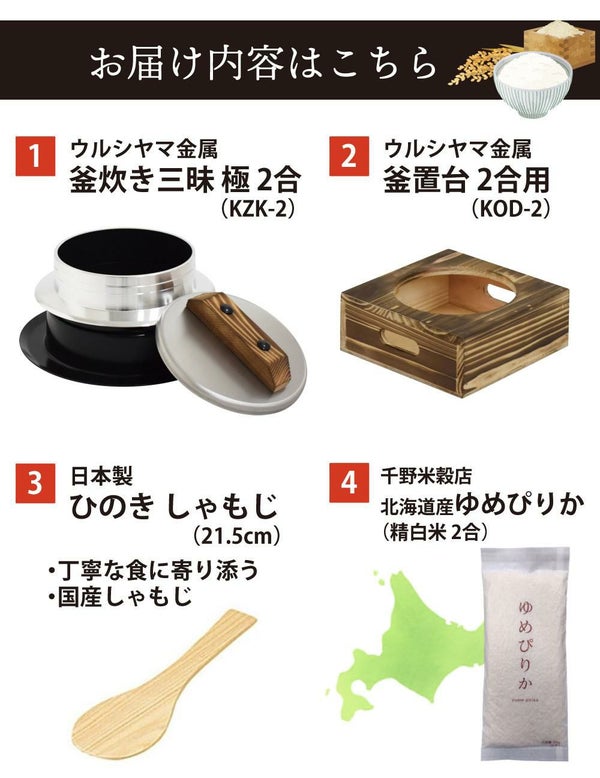 「釜炊き三昧 極」を中心に、専用の置き台、檜のしゃもじ、そして北海道産ゆめぴりか。