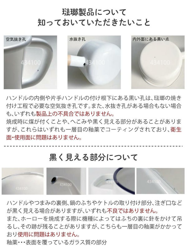 ※ホーロー製品は手作業で釉薬をかけておりますので、多少の個体差がございます。鍋本体や蓋に黒点や塗りムラが見られる場合がありますが、製造工程上避けられないもので、安心してご使用頂けます。このような理由での交換・返品はお受けできかねますのでご了承ください。