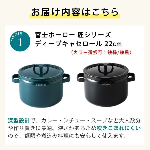 | 1)富士ホーロー 匠シリーズ 22cm ディープキャセロール TKM-22DW (カラー選択可:鉄緑/鉄黒)
