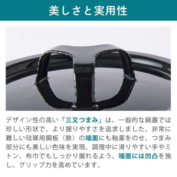 デザイン性の高い「三叉つまみ」は、一般的な鍋蓋では珍しい形状で、より握りやすさを追求しました。非常に難しい琺瑯用鋼板(鉄)の端面にも釉薬をのせ、つまみ部分にも美しい色味を実現。調理中に滑りやすい手やミトン、布巾でもしっかり握れるよう、端面には凹凸を施し、グリップ力を高めています。