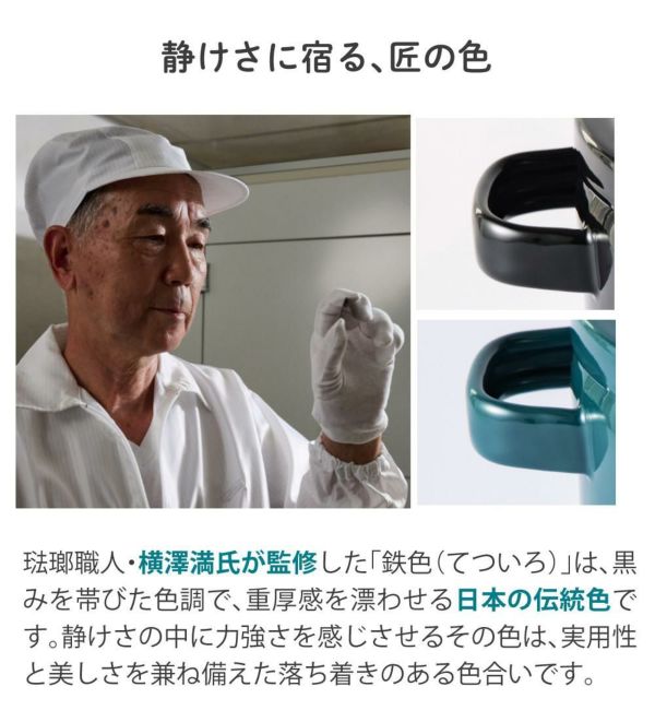 琺瑯職人・横澤満氏が監修した「鉄色(てついろ)」は、黒みを帯びた色調で、重厚感を漂わせる日本の伝統色です。