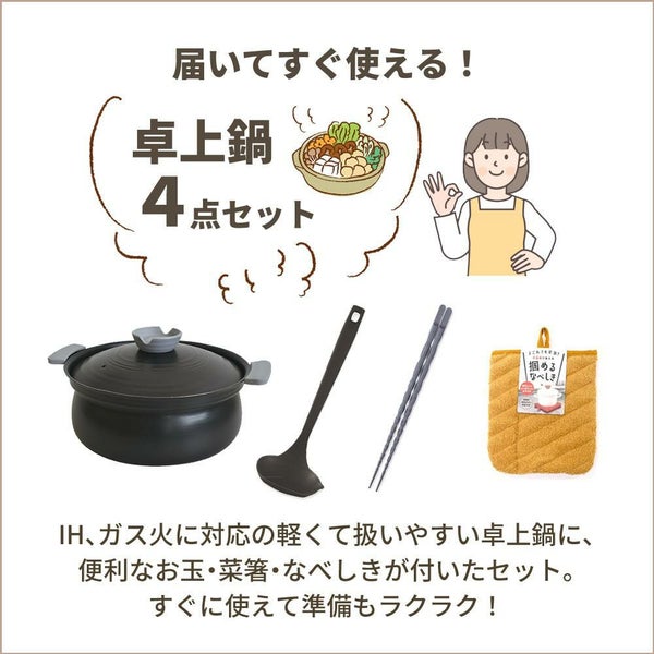 お玉 菜箸 なべしき が セット に なっている ので、届いてすぐ に 鍋料理 を 楽しめます。