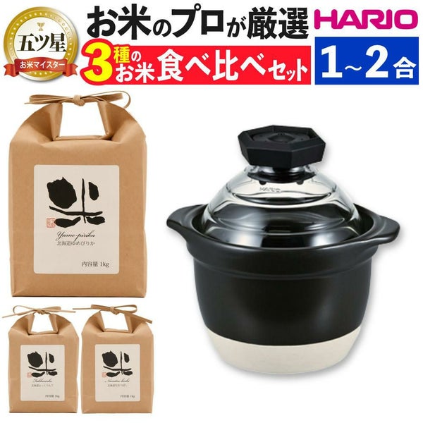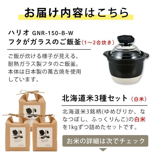 HARIO フタがガラスのご飯釜1~2合 GNR-150-B-W &北海道米3種食べ比べ 2点セット