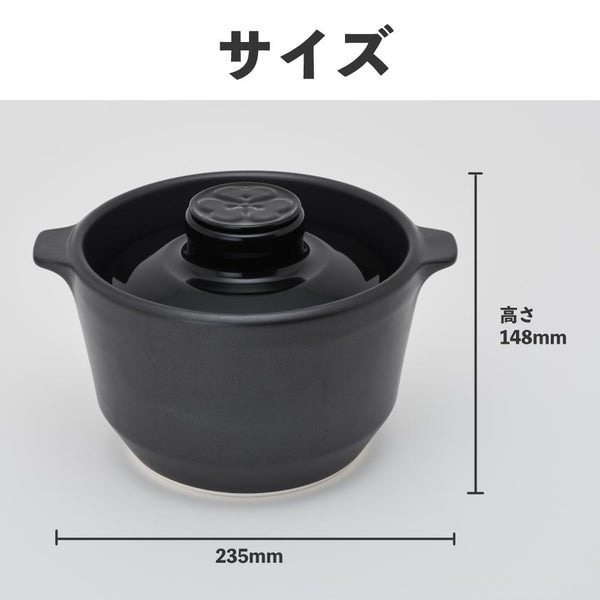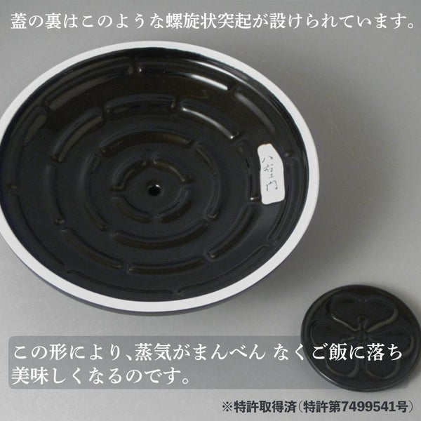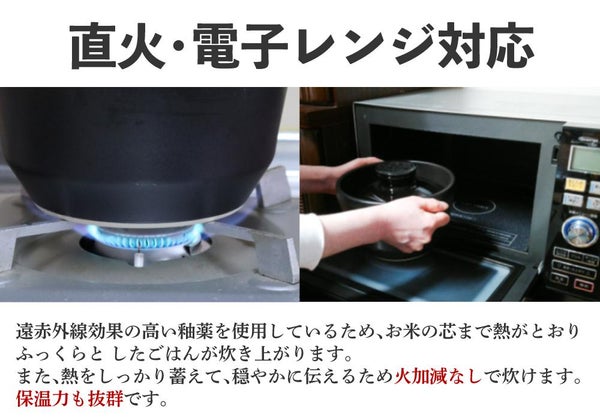 遠赤外線効果の高い釉薬を使用しているため、お米の芯まで熱がとおり、ふっくらとしたごはんが炊き上がります。また、熱をしっかり蓄えて、穏やかに伝えるため火加減なしで炊けます。保温力も抜群です。
