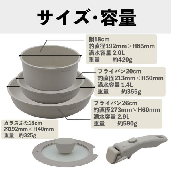 【付属品】フライパン 20cm / フライパン 26cm / 鍋 18cm / ガラスふた 18cm / 取っ手
