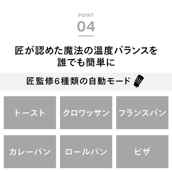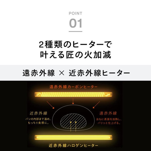 遠赤外線・近赤外線2種類のヒーターがパンの外側と内部それぞれにアプローチすることで、匠が認めた「魔法の温度バランス」に仕上げます。