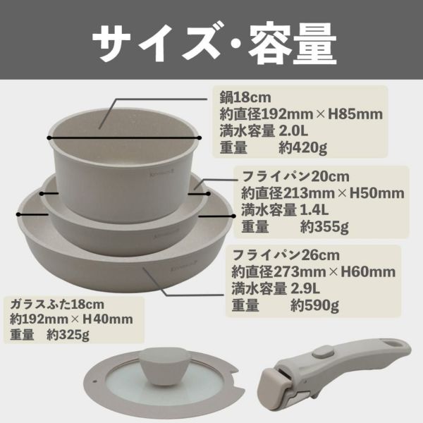 サイズ | フライパン 20cm :直径約21.3cm×高さ約5cm/重さ約355g/満水容量約1.4L フライパン 26cm:直径約27.3cm×高さ約6cm/重さ約590g/満水容量約2.9L 鍋 18cm :直径約19.3cm×高さ約8.5cm/重さ約420g/満水容量約2.0L ガラス ふた 18cm :直径約19.2cm×高さ約4cm/重さ約325g