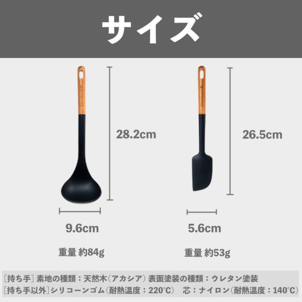 ナイロン+天然木(アカシア) 金属部:ステンレス鋼 シリコーンゴム(耐熱:220℃)、ナイロン(耐熱:140℃) |