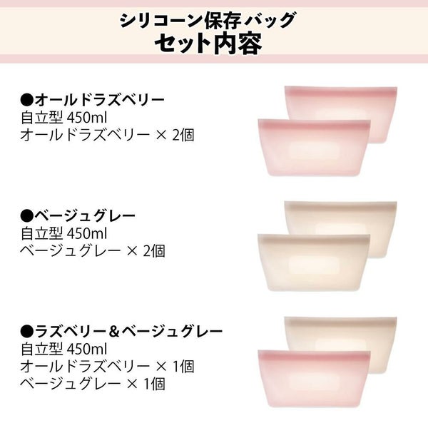 かいじるし シリコン保存バッグのカラーは オールドラズベリー (ラズベリー ピンク 桃色) と ベージュグレー (ベージュ 茶色 ブラウン グレージュ)。