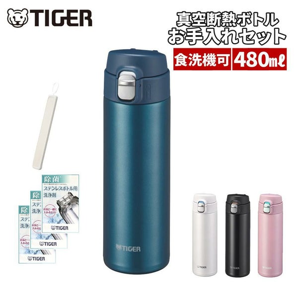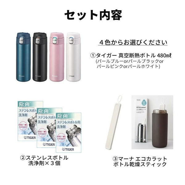 タイガー 真空断熱 ボトル MMJ?S048 は ワンプッシュ 開閉 と 片手 操作 が 可能 な ステンレス 魔法瓶 で、スーパークリーンPlus 内面加工 により 汚れ におい や 茶渋 が つきにくく、スポーツドリンク の 塩分 対応 も◎。パールカラー の 軽量 夢重力 ボトル(480ml)は 食洗機 対応 で 毎日 お手入れ 簡単。マーナ ボトル乾燥スティック(ECOCARAT 珪藻土)で 内部 を 速乾、衛生的 に。さらに ステンレスボトル洗浄剤(粉末 個包装)で 茶渋 除去 が 手軽 に行え、セット で 清潔 快適 な 使用感 を 実現。