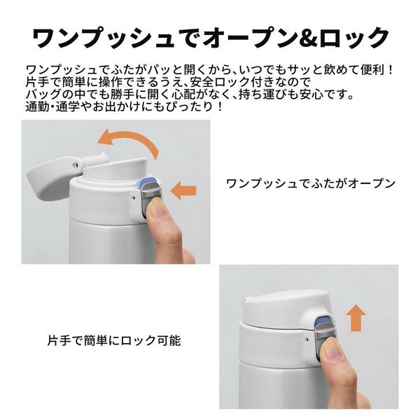 ワンプッシュでふたがオープン。片手で操作できる安全ロックつきで持ち運びも安心。